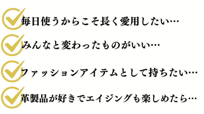 新品時はマットな印象ですが、使い込むほどにツヤが増し、色も深まる経年変化を楽しめます。